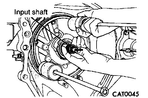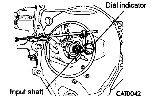 Attach a dial indicator to transaxle bell-housing with its plunger seated against end of input shaft.