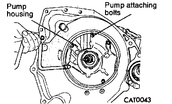 15. Remove pump attaching bolts.