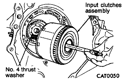 13. Measuring input shaft end play before disassembly will usually indicate when a No. 4 thrust plate change is required (except when major parts are replaced). The No. 4 thrust plate is located behind the overdrive clutch hub.