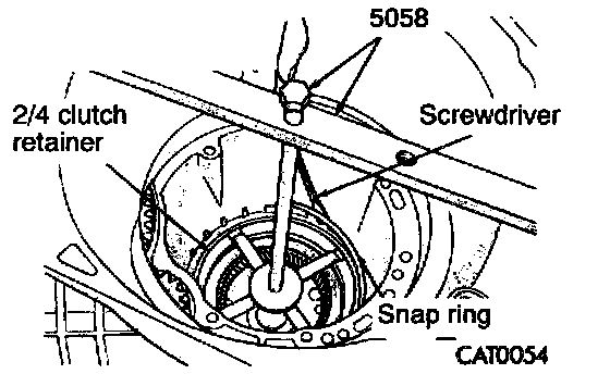 26. Install spring compressor (5058). Using the special tool, compress the 2/4 clutch retainer just enough to remove the snap ring.