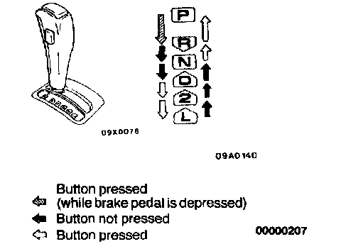 1. Shift selector lever to each range and check that lever moves smoothly and clicks into position. Check that position indicator is correct.2. Check that the selector lever can be shifted to each position (by button operation as shown in the illustration).