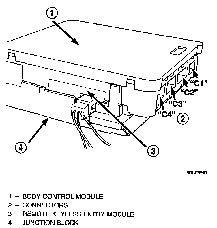 The Remote Keyless Entry (RKE) Module is located between the junction block and body control module.