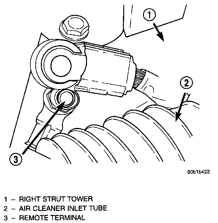 1. Open hood, disconnect and isolate the negative battery cable remote terminal from the remote battery post.