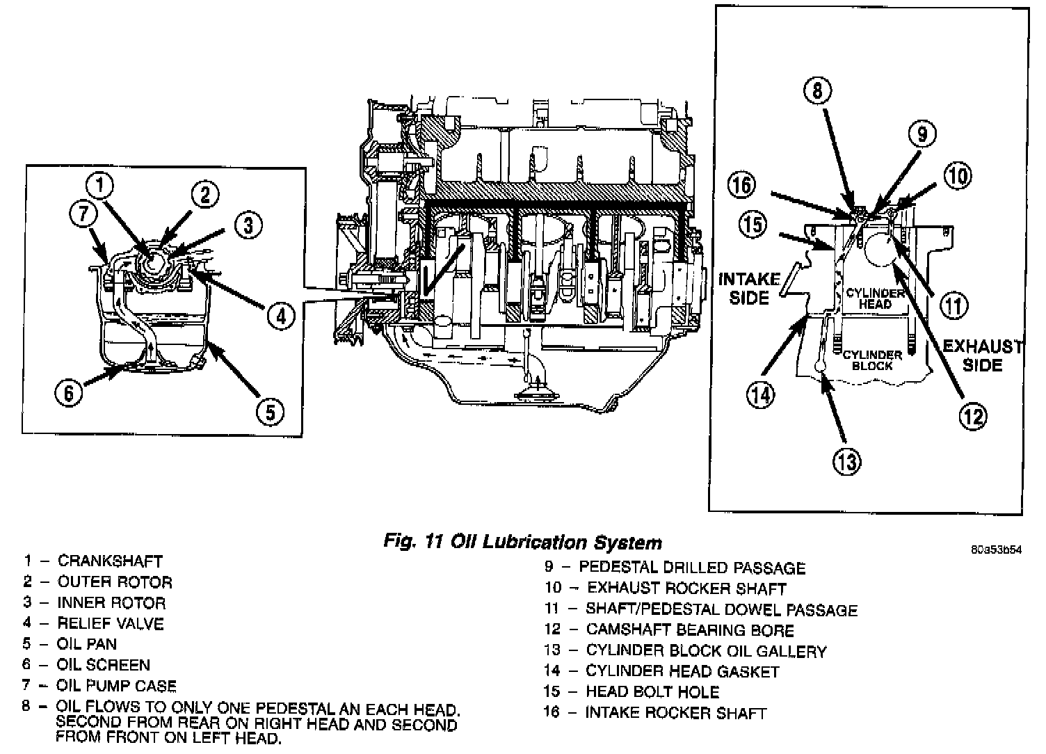 DESCRIPTIONSystem is a full-flow filtration, pressure feed type. The oil pump body is mounted to the engine block. The pump inner rotor is driven by the crankshaft. A windage tray, increases power by minimizing oil windage at high engine RPM. For increased oil cooling, an oil-to-coolant oil cooler is used. This cooler is mounted inside the radiator tank.