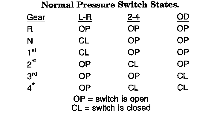 The Transmission system uses three pressure switches to monitor the fluid pressure in the L-R, 2-4, and OD elements. The pressure switches are continuously monitored for the correct states in each gear as shown in image.
