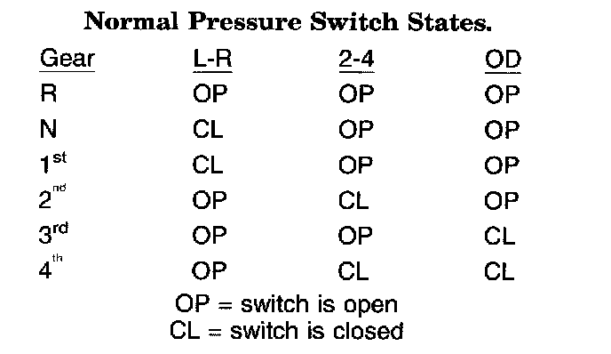 The Transmission system uses three pressure switches to monitor the fluid pressure in the L-R, 2-4, and OD clutch circuits. The pressure switches are continuously monitored for the correct states in each gear as shown below.