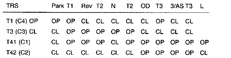 The T1, T3, T41, and T42 sense circuits communicate the shift lever position to the TCM. Each circuit is terminated at the transmission with a switch. Each switch can be either open or closed, depending on the shift lever position. The TCM can decode this information and determine the shift lever position. Each shift lever position has a certain combination of switches which will be open and closed, this is called a PRNDL code. There are 4 switches, therefore: there are many possible combinations of open and closed switches (codes). However, there are only 9 valid codes (8 for Autostick), one for each gear position and three recognized between gear codes. The remainder of the codes should never occur, these are called invalid codes. The following chart shows the normal switch states for each shift lever position.