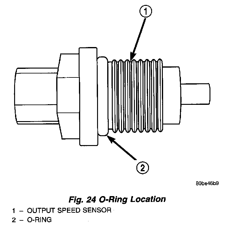 The Output Speed Sensor is a two-wire magnetic pickup device that generates an AC signal as rotation occurs. It is threaded into the transaxle case (Fig. 23), sealed with an O-ring (Fig. 24), and is considered a primary input to the Transmission Control Module (TCM).