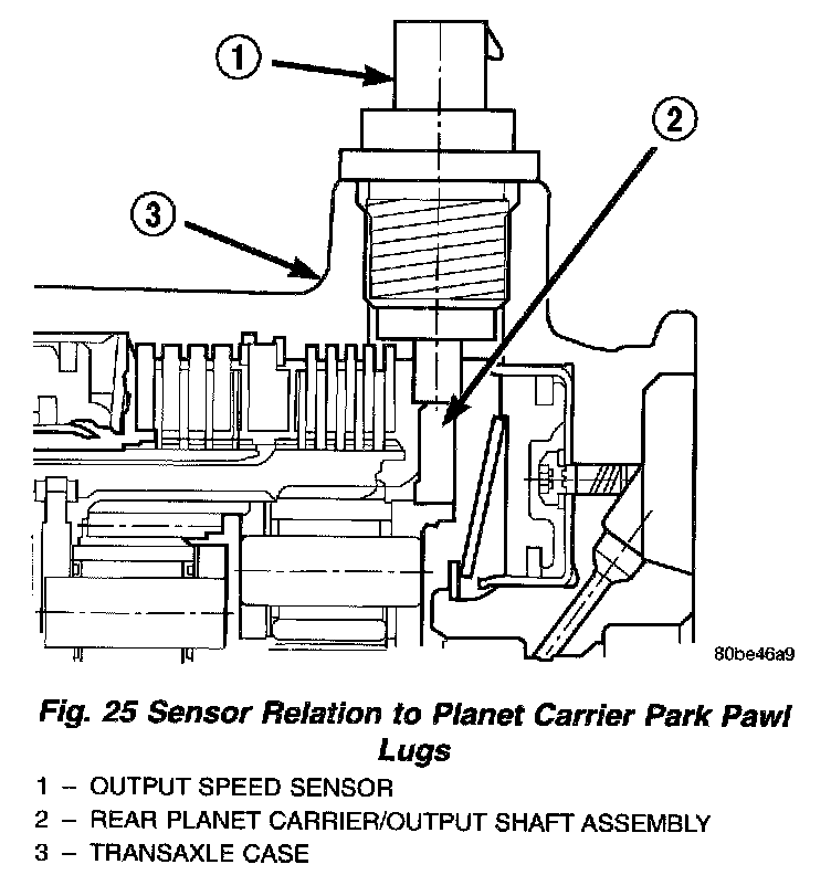 The Output Speed Sensor provides information on how fast the output shaft is rotating. As the rear planetary carrier park pawl lugs pass by the sensor coil (Fig. 25), an AC voltage is generated and sent to the TCM. The TCM interprets this information as output shaft rpm.