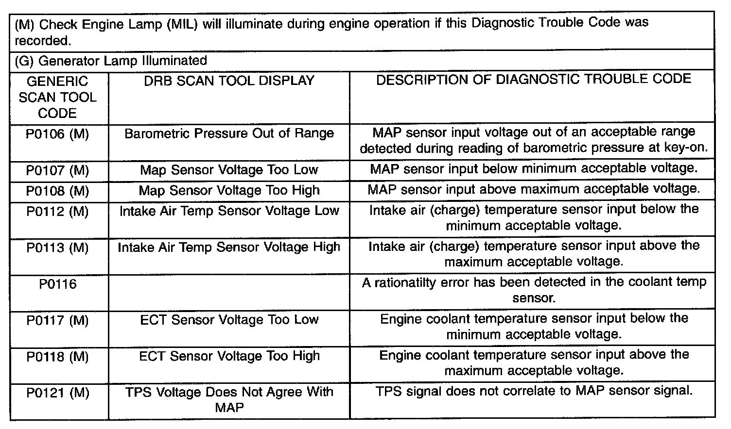 Diagnostic Trouble Code Description Chart P0106 - P0121: