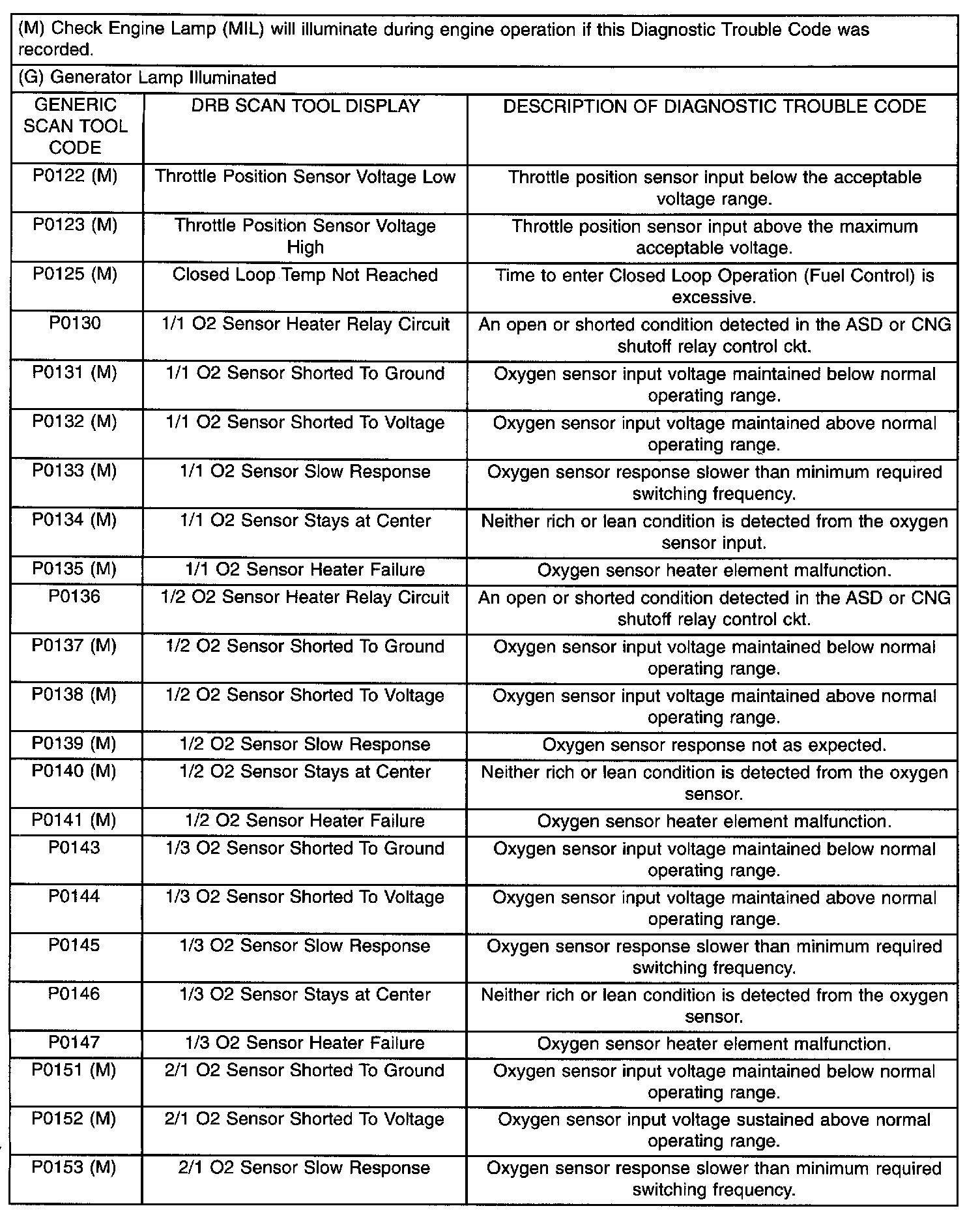 Diagnostic Trouble Code Description Chart P0122 - P0153: