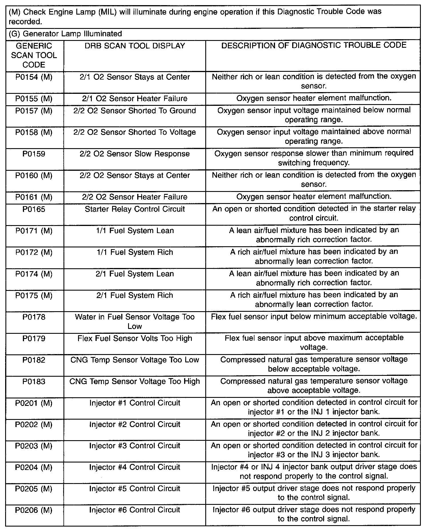 Diagnostic Trouble Code Description Chart P0154 - P0206: