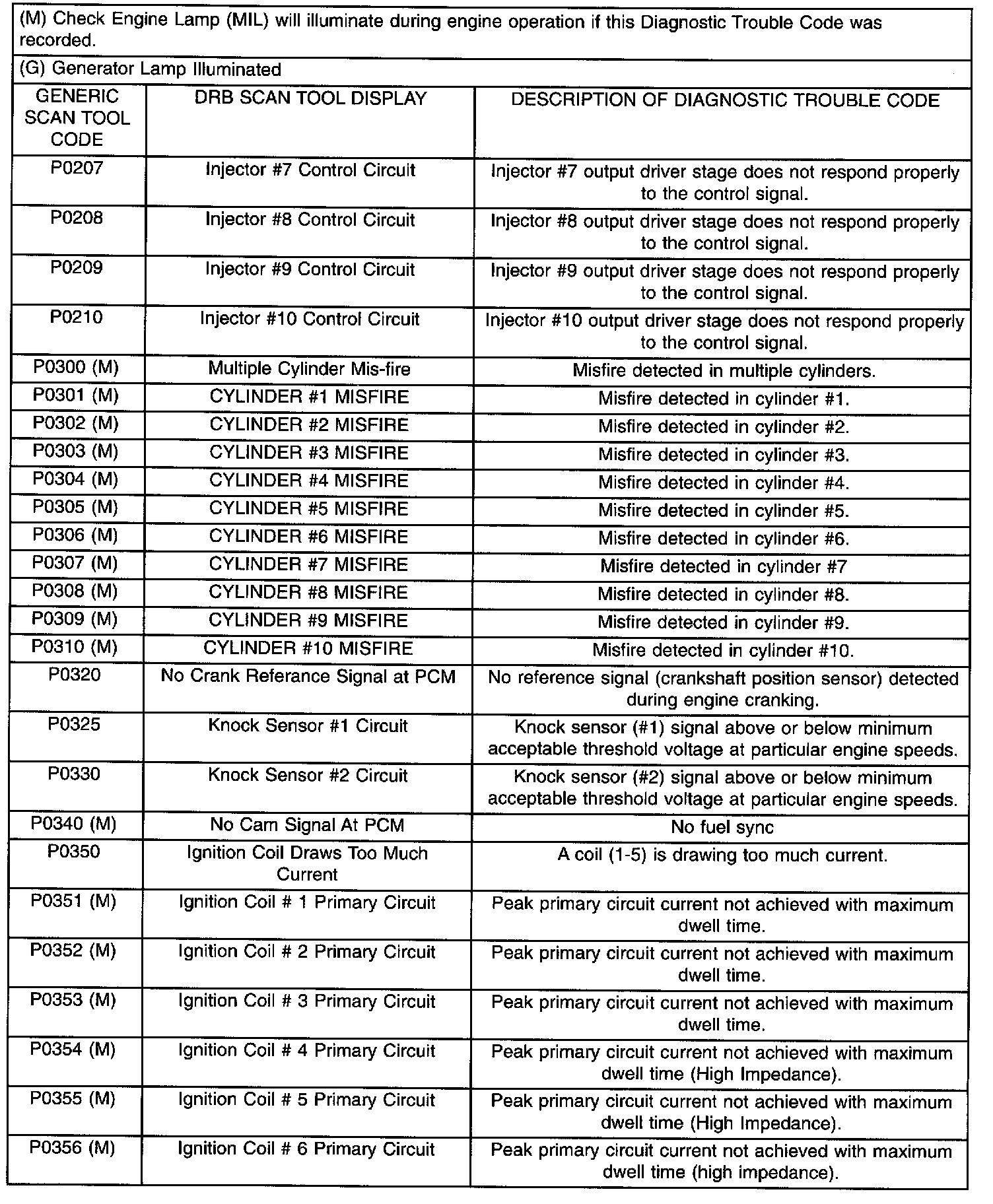Diagnostic Trouble Code Description Chart P0207 - P0356: