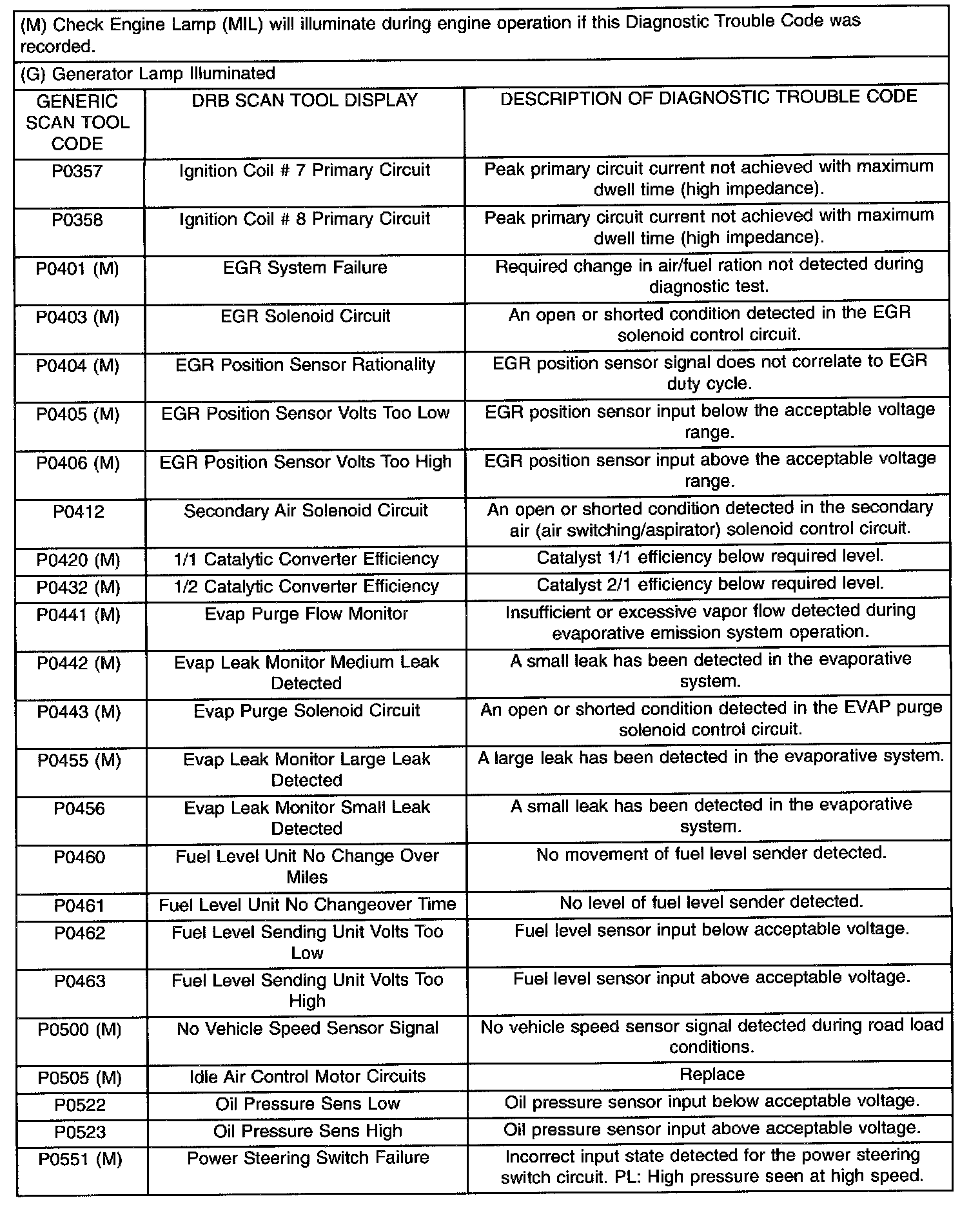 Diagnostic Trouble Code Description Chart P0357 - P0551: