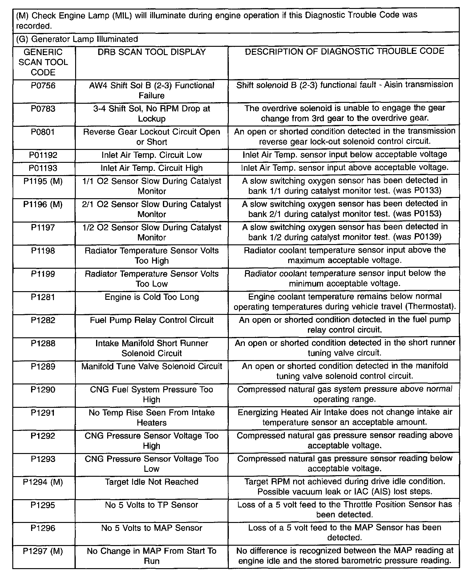 Diagnostic Trouble Code Description Chart P0756 - P1297: