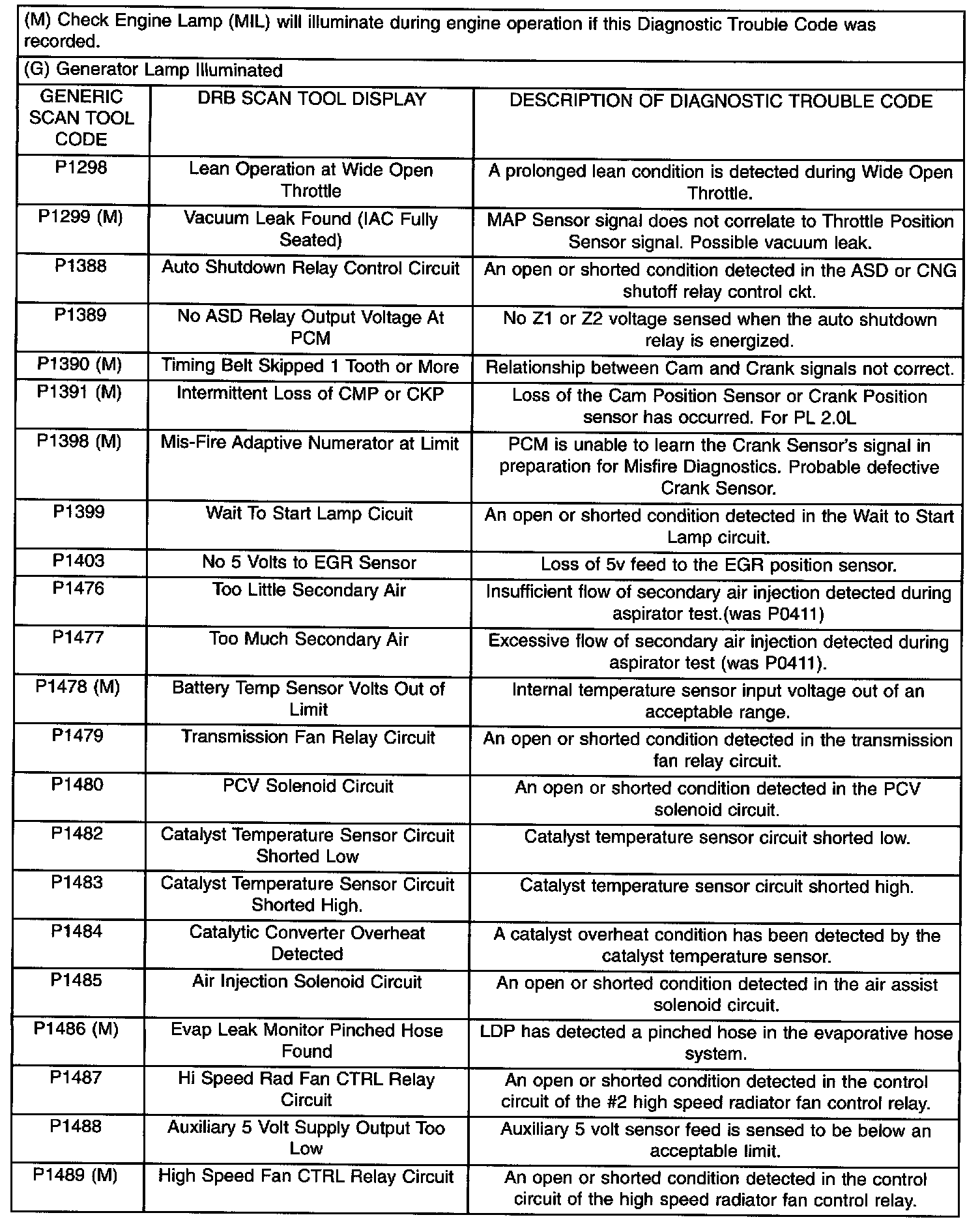 Diagnostic Trouble Code Description Chart P1298 - P1489: