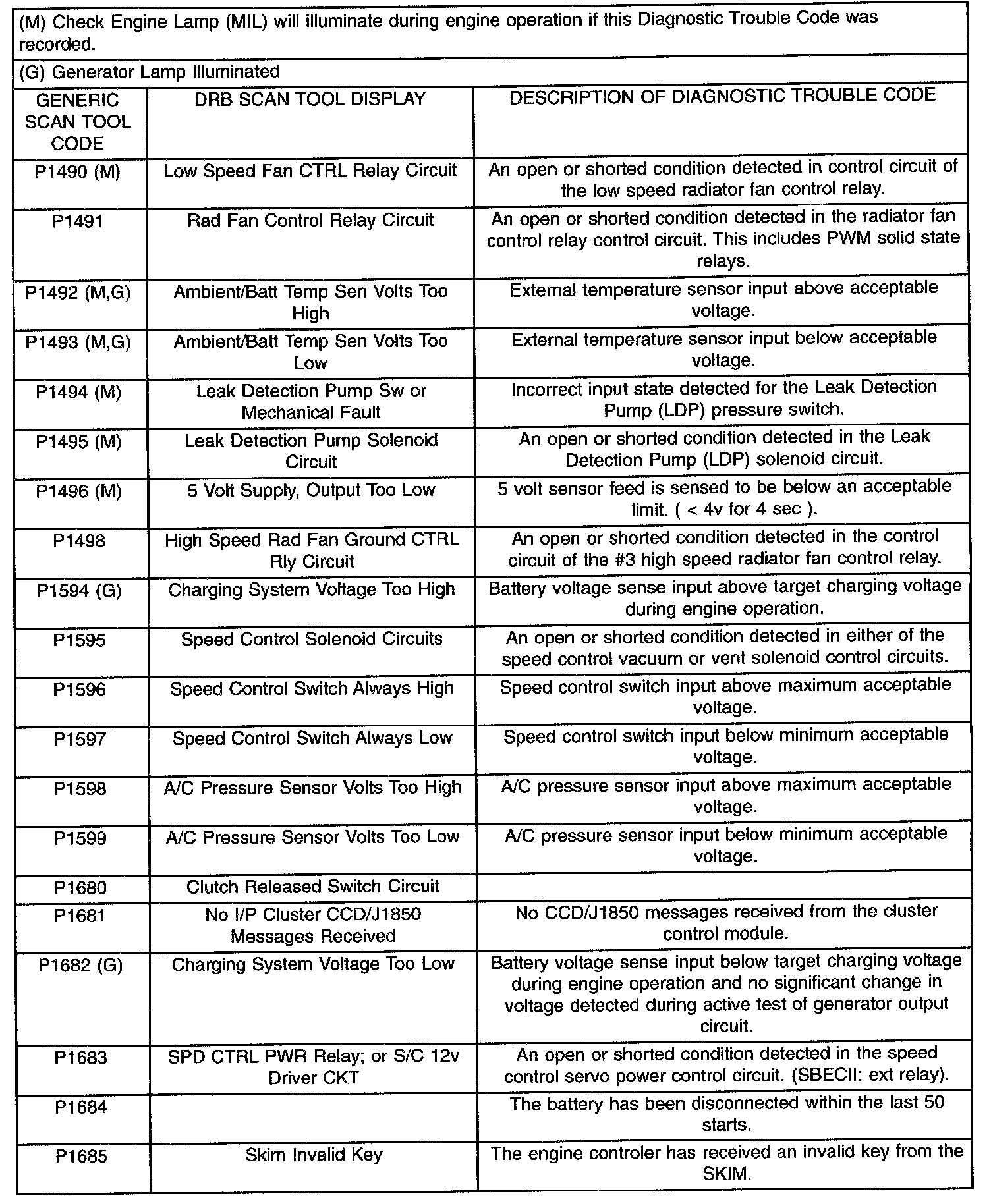 Diagnostic Trouble Code Description Chart P1490 - P1685: