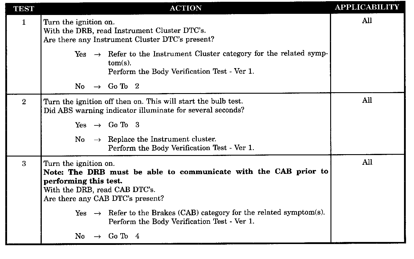 When Monitored: Ignition on. The CAB will periodically send a status message of the ABS warning indicator to the Mechanical Instrument Cluster (MIC) via the PCI BUS. The CAB monitors the message that is received from the instrument cluster for the proper state.