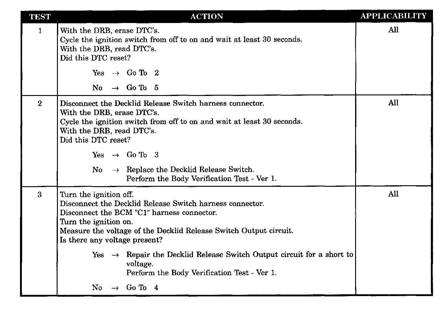 The BCM monitors voltage present on the decklid release switch output circuit. If voltage is present for over 30 seconds , this DTC will set.