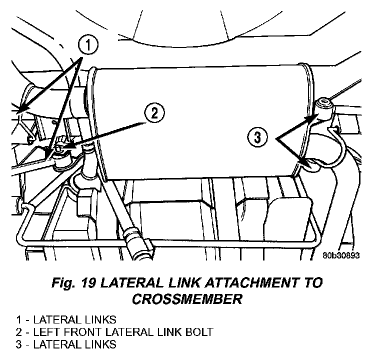 CAUTION: The bolts attaching the forward lateral links to the crossmember must be installed with the bolts pointing rearward (Fig. 19) to prevent damage to the fuel tank and or fuel tubes. Also, when installing the bolt attaching the left rear lateral link, install the bolt pointing forward to prevent damage to the fuel filler tube.