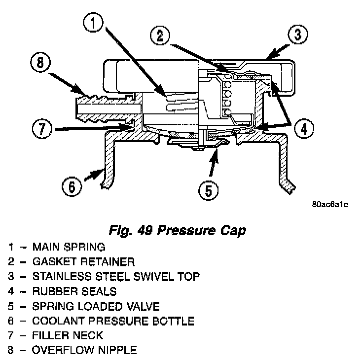 Remove the pressure tester hold the cap in hand, right side up. The vent valve at the bottom of the cap should not open. If the rubber gasket has swollen and prevents the valve from closing, replace the cap.