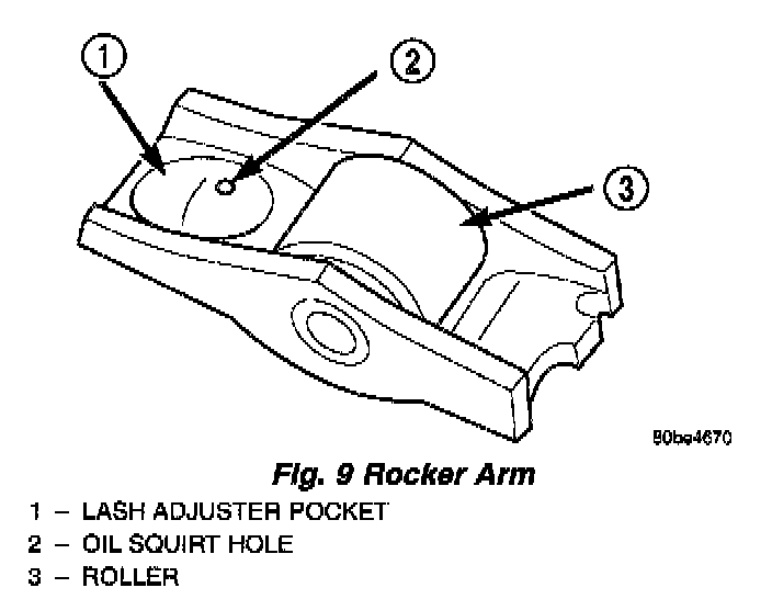 The rocker arms are composed of steel stampings with an integral roller bearing (Fig. 9). The rocker arms incorporate a 0.5 mm (0.0197 inch) oil hole in the lash adjuster socket for roller/camshaft lobe lubrication (Fig. 9).