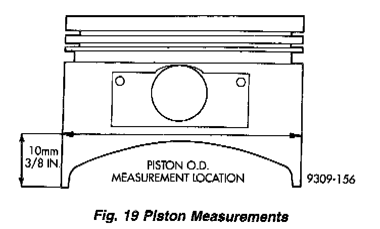 Piston and cylinder wall must be clean and dry. Piston diameter should be measured 90° to piston pin at size location shown in (Fig. 19). Cylinder bores should be measured halfway down the cylinder bore and transverse to the engine crankshaft center line. Refer to Cylinder Block Assembly and/or Piston, Engine Specifications. Pistons and cylinder bores should be measured at normal room temperature, 70°F (21°C).