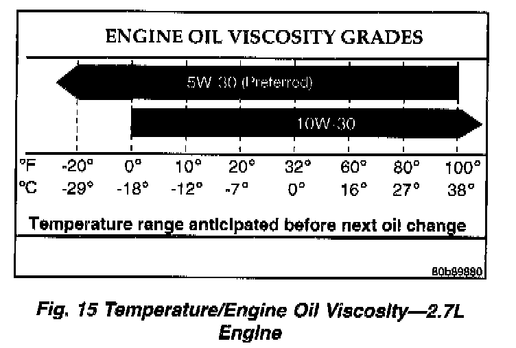An SAE viscosity grade is used to specify the viscosity of engine oil. Use only engine oils with multiple viscosities such as 5W-30 or 10W-30. The preferred viscosity oil for the 2.7L engine is 5W-30. These oils are specified with a dual SAE viscosity grade which indicates the cold-to-hot temperature viscosity range. Select an engine oil that is best suited to your particular temperature range and variation (Fig. 15).