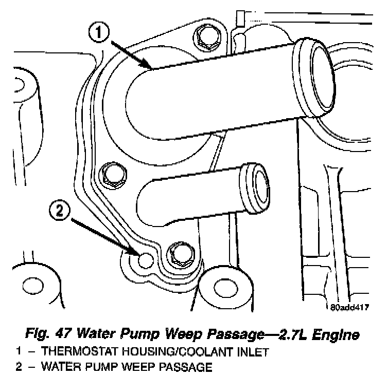 NOTE: It is normal for the water pump to weep a small amount of coolant from the weep hole (black stain on water pump body). Do not replace the water pump if this condition exists. Replace the water pump if a heavy deposit or a steady flow of engine coolant is evident on water pump body (3.2/3.5L) or from the weep passage (2.7L). This indicates a shaft seal failure and pump must be replaced. Be sure to perform a thorough analysis before replacing water pump.