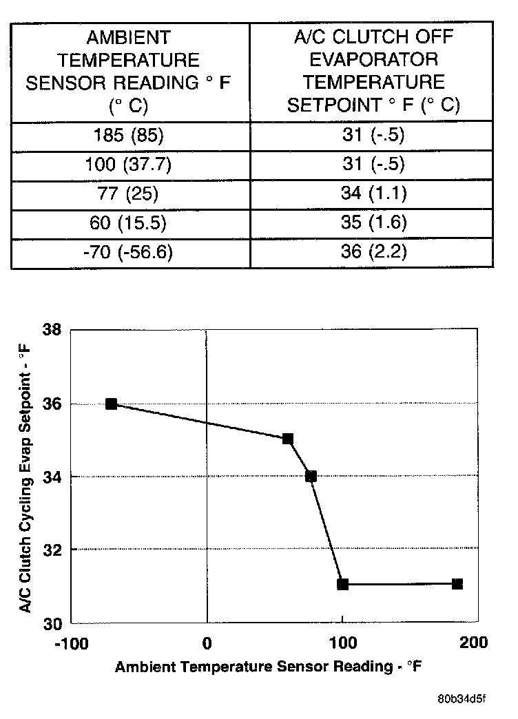 The Body Control Module (BCM) will send a Programmable Communications Interface (PCI) bus message to the Powertrain Control Module (PCM), which will check engine, coolant temperature, and refrigerant pressure temperature before turning ON the A/C Compressor Clutch. Turning ON the A/C Compressor Clutch will allow the system to cool the evaporator. The BCM will send a message to the PCM when the evaporator temperature becomes too cold. The PCM will then turn OFF the A/C Compressor Clutch, before evaporator freeze up occurs. The DRB III scan tool can be used to monitor this operation. The temperature setpoint at which the clutch is turned OFF varies with the outside ambient temperature. The temperature at which the clutch is turned ON is preset to 2° F above the OFF setpoint mentioned above. Refer to Evaporator Temperature Sensor Setpoint table and for the correct setpoint.
