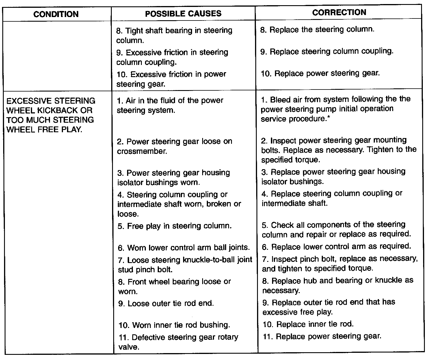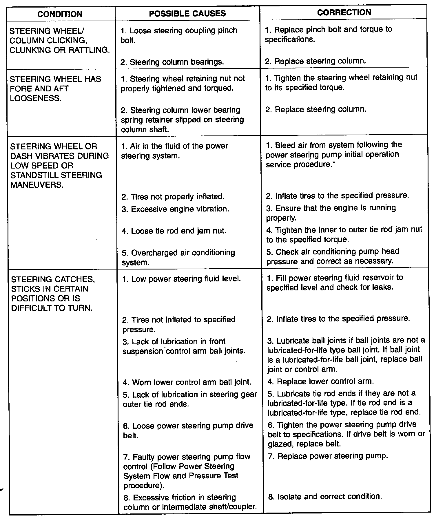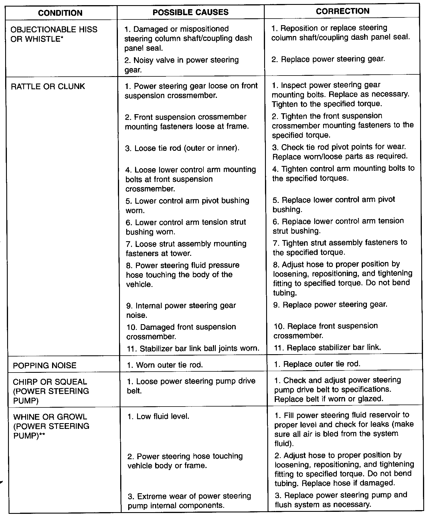 *NOTE: There is some noise in all power steering systems. One of the most common is a hissing sound evident when turning the steering wheel when at a standstill or when parking and the steering wheel is at the end of its travel. Hiss is a very high frequency noise similar to that experienced while slowly closing a water tap. The noise is present in every valve and results when high velocity fluid passes valve orifice edges. There is no relationship between this noise and the performance of the steering system.