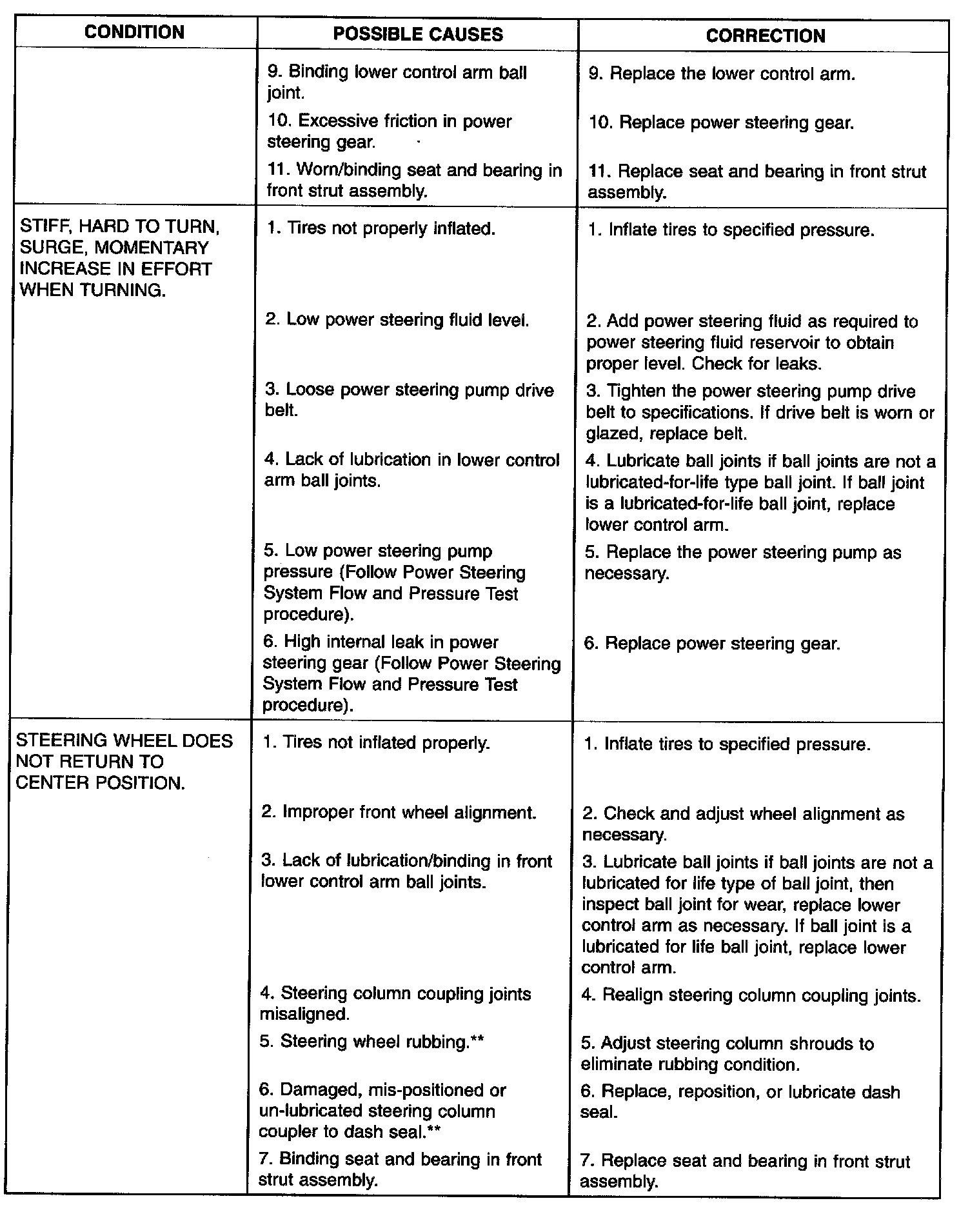 **NOTE: To evaluate this condition, it may be necessary to disconnect the coupling at the base of the steering column. Turn the steering wheel and feel or listen for internal rubbing in steering column. To avoid damaging the column clockspring, note the following. Before disconnecting coupling, place tires in the straight-ahead position and center steering wheel. Once disconnected, DO NOT rotate steering wheel more than one revolution in either direction and place steering wheel in original location before reconnecting coupling. If this position is lost, the steering column clockspring must be recentered following the procedure found within the procedure for steering column installation.