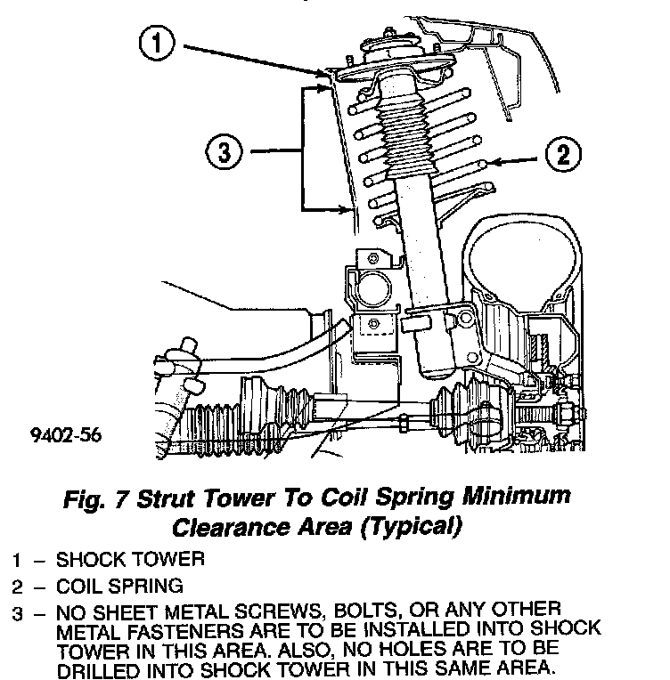- At no time when servicing a vehicle, can a sheet metal screw, bolt or other metal fastener be installed in the shock tower to take the place of an original plastic clip. Also, NO holes can be drilled into the front shock tower in the area shown, for the installation of any metal fasteners into the shock tower. Because of the minimum clearance in this area, installation of metal fasteners could damage the coil spring coating and lead to a corrosion failure of the spring.
