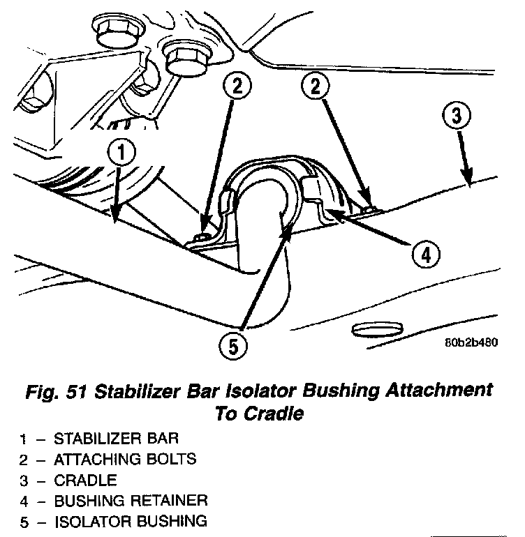 13. Remove both stabilizer bar isolator bushing retainers and bushings from stabilizer bar.