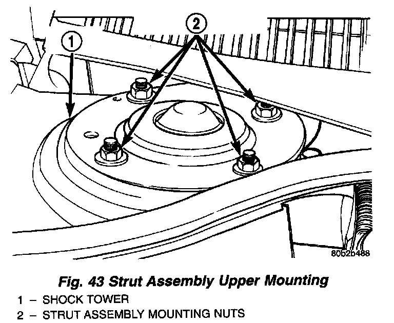 1. Remove the 4 strut assembly upper mount to strut tower mounting nut and washer assemblies securing the right front strut in place.