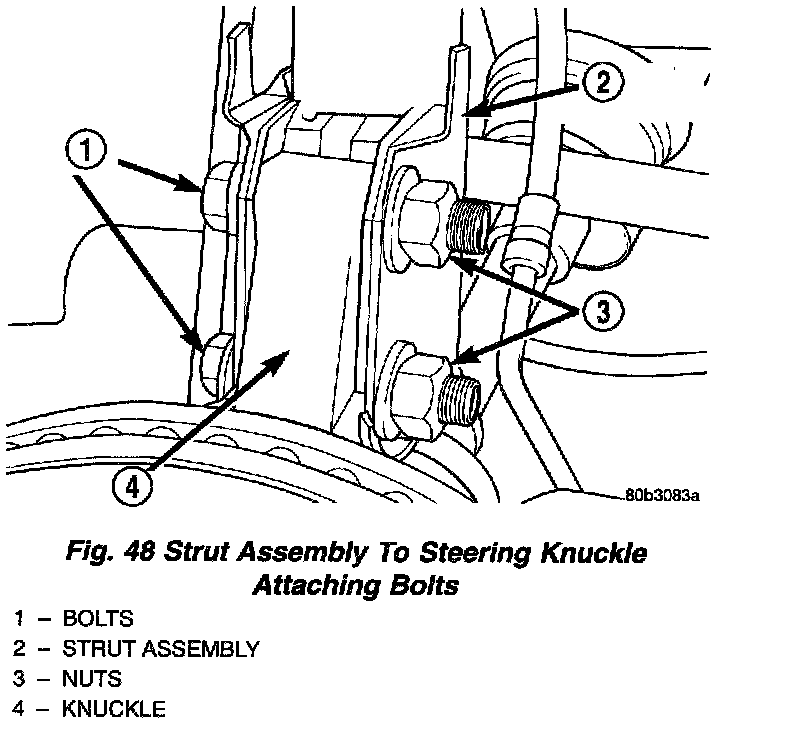 CAUTION: The strut assembly to steering knuckle bolts are serrated were they go through strut assembly and steering knuckle. When installing bolts, turn nuts onto bolts DO NOT TURN BOLTS IN STEERING KNUCKLE. If bolts are turned damage to steering knuckle will result.