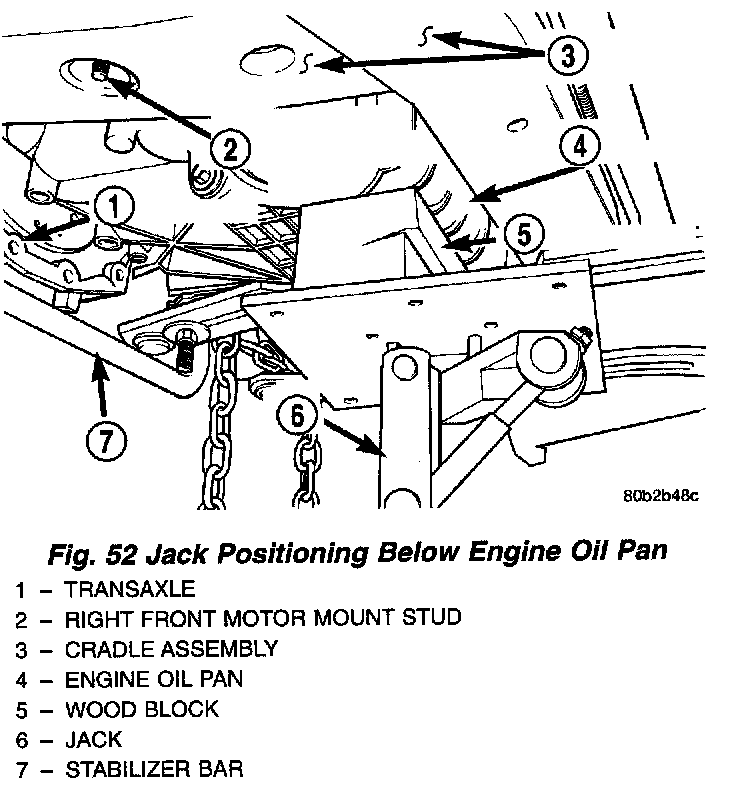 14. Position a transmission jack under the body of the engine oil pan . Use a wood block as a buffer between the jack and the engine oil pan in order to avoid damage to the pan. Carefully raise the jack until the motor mounts clear the cradle assembly. It may be necessary to raise the jack further.