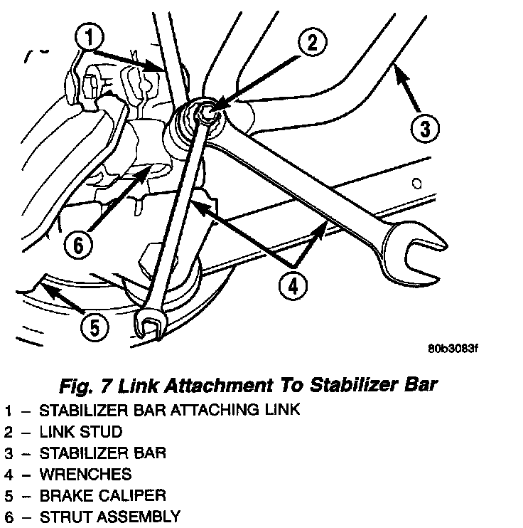 2. Install a thin wrench on the hex of the attaching link stud to keep the stud from turning in the link. Next, remove the nut from the stabilizer bar to strut assembly attaching link stud at the stabilizer bar. Remove the link from the stabilizer bar. Repeat this procedure on the other side of the vehicle for the other attaching link.