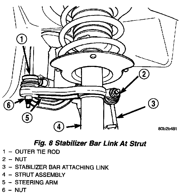 3. Remove the stabilizer bar attaching link nut at the strut assembly. Remove the attaching link from the strut assembly.