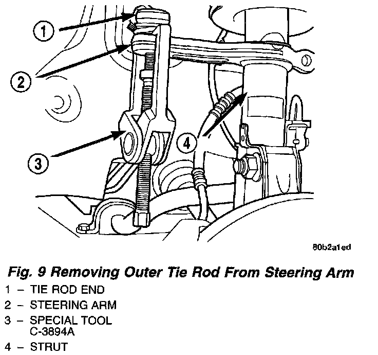4. Loosen, but do not remove, the outer tie rod end to strut arm attaching nut. Release outer tie rod end from steering arm using Puller, Special Tool C-3894A, then remove nut and tie rod from the steering arm.