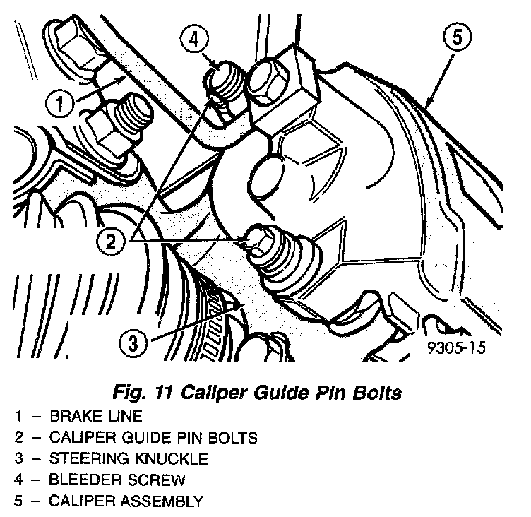 6. Remove the 2 guide pin bolts mounting the caliper assembly to the steering knuckle.