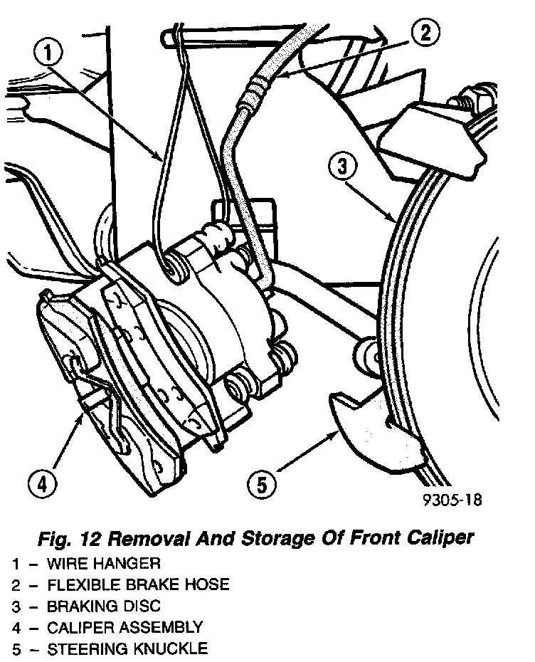 7. Remove brake caliper assembly from steering knuckle and braking disc. Refer to the Brakes and Traction Control for the required caliper removal procedure. Support caliper assembly by hanging it from frame of vehicle with wire or some other method, do not let caliper assembly hang by brake hose. Remove front braking disc from hub.