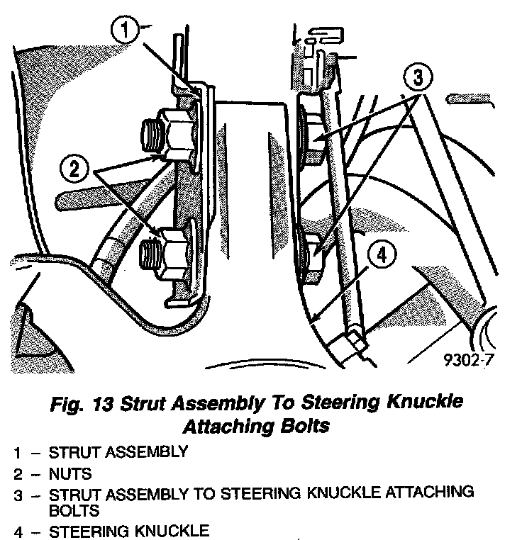CAUTION: The strut assembly to steering knuckle bolts are serrated were they go through strut assembly and steering knuckle. When removing bolts, turn nuts off bolts DO NOT TURN BOLTS IN STEERING KNUCKLE. If bolts are turned damage to steering knuckle will result.