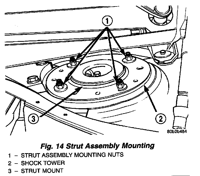 1. Install front strut assembly into shock tower. Install the 4 strut assembly upper mount to shock tower attaching nuts. Tighten the 4 strut mount to strut tower attaching nuts to a torque of 37 Nm (28 ft. lbs.) torque.