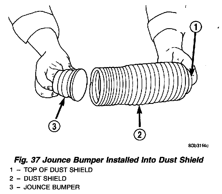4. Install the jounce bumper into the dust shield from the bottom. The jounce bumper should snap into position at the top end of the dust shield.