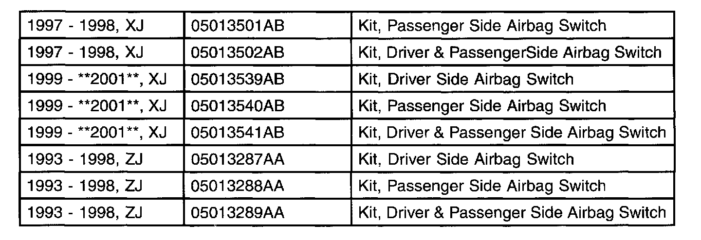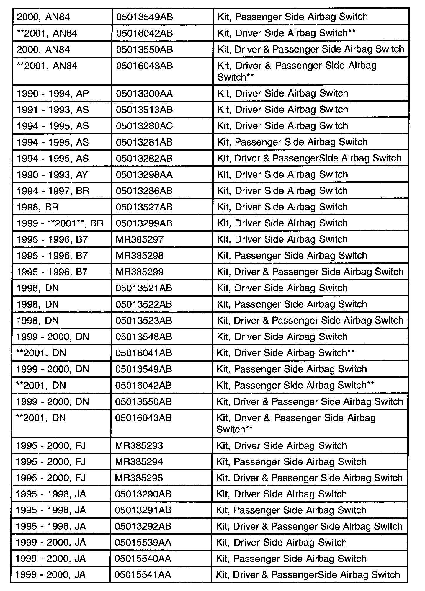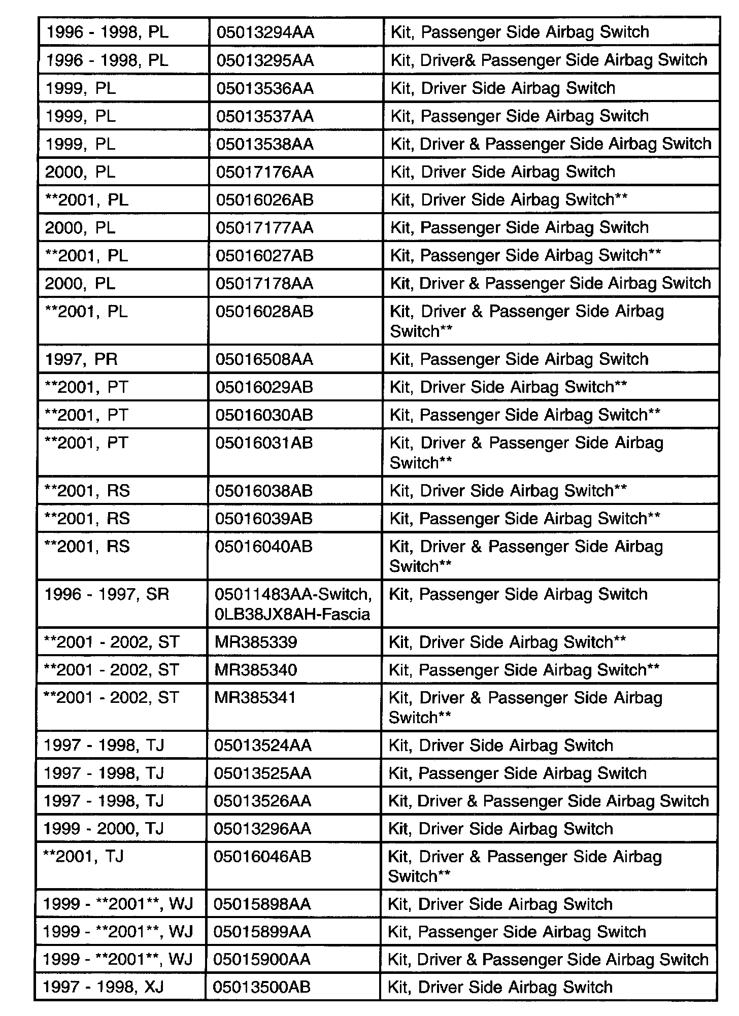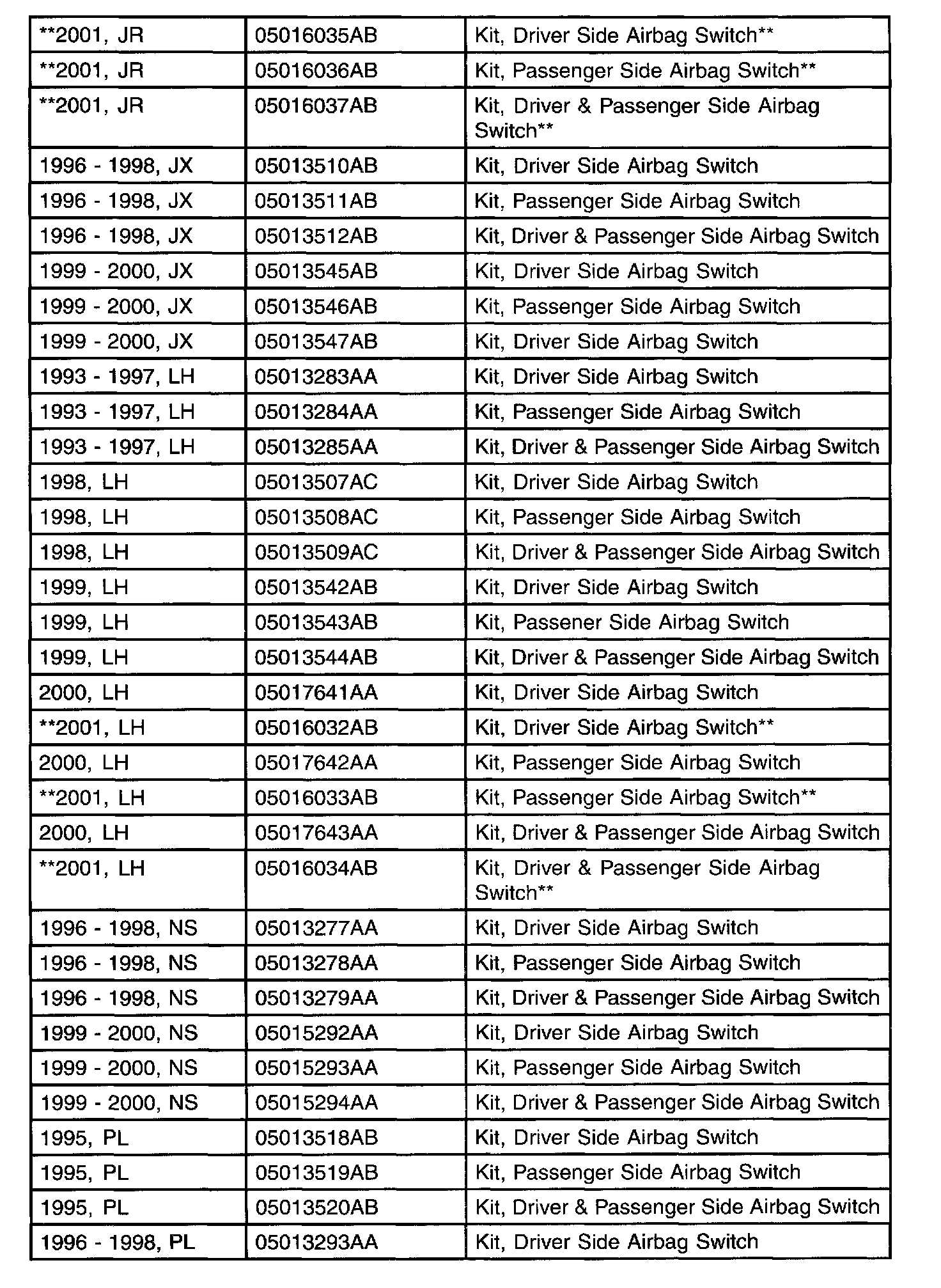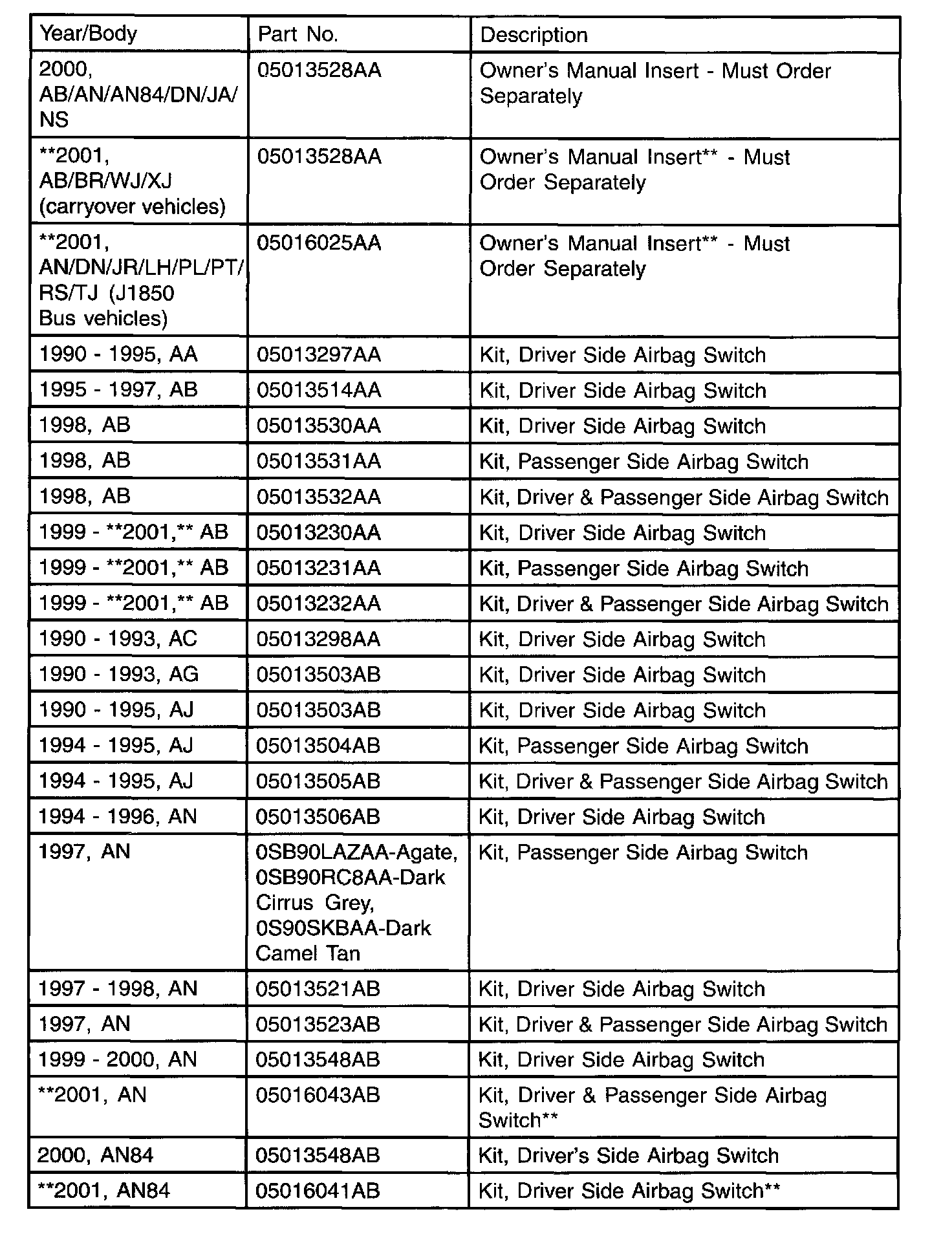 **FOR SOME 2001 MODEL YEAR APPLICATIONS (WITH J1850 BUS, AN/AN84/DN/JR/LH/PL(PT/RS/TJ) A NEW OWNER'S MANUAL INSERT IS REQUIRED, P/N 05016025AA, AND MUST BE ORDERED IN ADDITION TO THE AIRBAG SWITCH KIT. THE NEW INSERT MUST BE PRESENTED TO THE CUSTOMER AFTER INSTALLATION.**