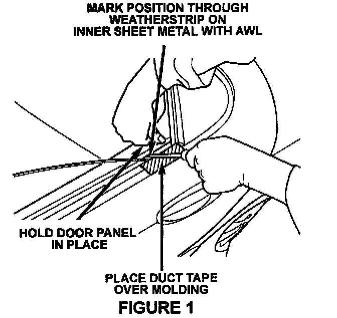 5. With an awl puncture the inner belt weatherstrip or drill a 1/8" pilot hole to mark the location on the sheet metal inner panel (Figure 1). The mark/hole should be approximately 35 mm (1-3/8 in.) from the rear of the panel to avoid the locating hole already in the sheet metal inner.