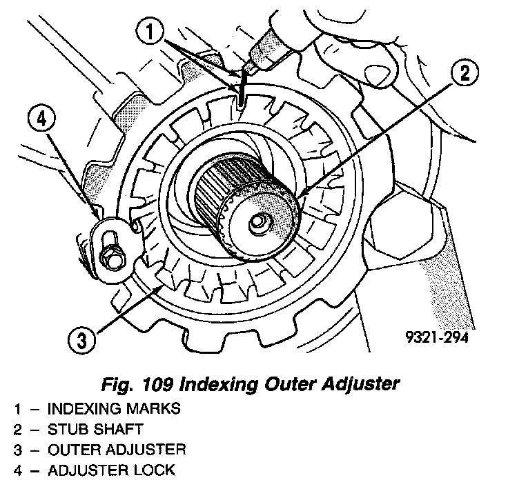 6. Index outer adjuster (Fig. 109). Remove lock bracket and back out adjuster exactly one revolution. Then remove differential cover.