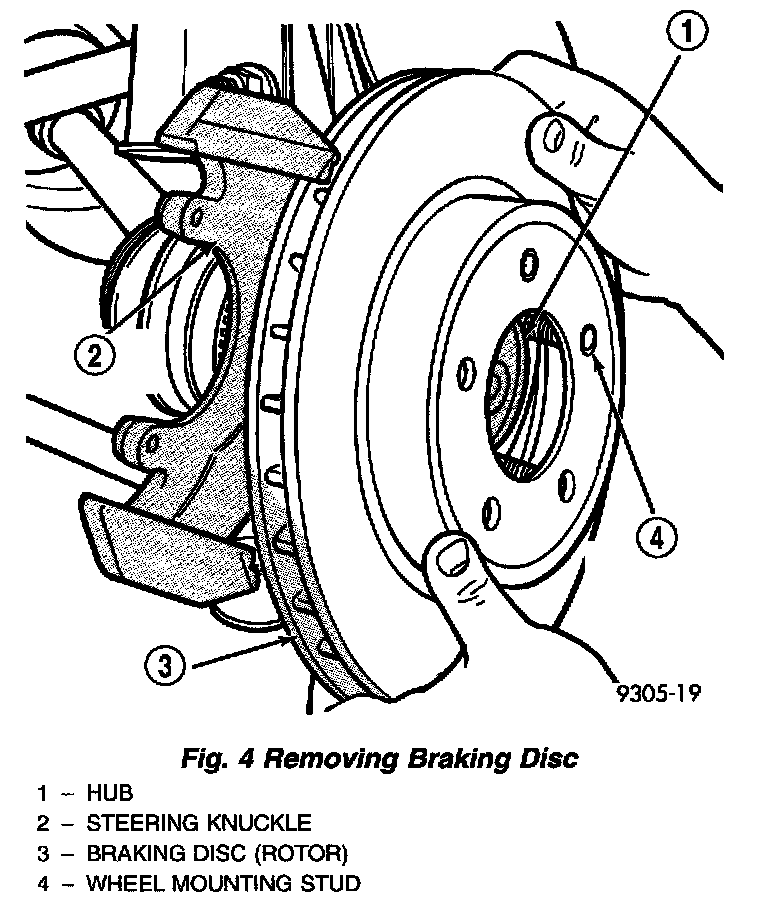 4. Remove front braking disk (rotor) from hub, by, pulling it straight off wheel mounting studs (Fig. 4).