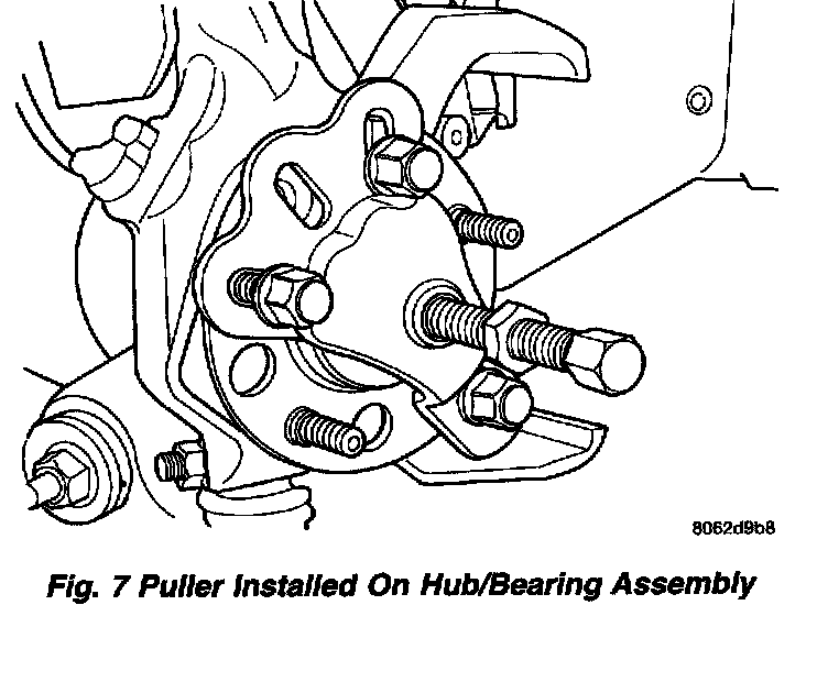 7. Install Puller, Special Tool 6790 on hub and bearing assembly (Fig. 7), using wheel lug nuts to secure it in place.